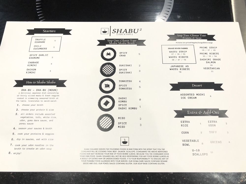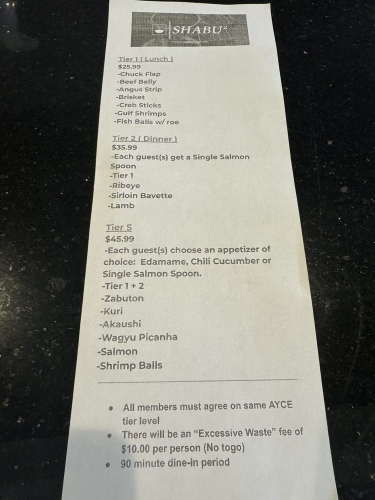 Shabu Squared offers a trendy and intimate dining experience in Houston, specializing in Japanese hot pot. With a variety of tiers to choose from, customers rave about the quality of the meats and fresh ingredients. The AYCE option is a must-try, with options like spicy crab and tonkotsu broth receiving praise. The attentive service and knowledgeable staff add to the overall enjoyable dining experience. Customers recommend trying the salmon spoon appetizer and experimenting with the spicy drops for added flavor. The restaurant's clean interior and quick service make it a top choice for hot pot enthusiasts. Shabu Squared's AYCE menu strikes a perfect balance between indulgence and affordability, making it a favorite spot for many.